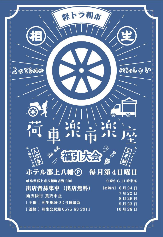 地元あいおいの新鮮野菜からおいしいものなど、楽しい企画がいっぱいの荷車楽市楽座へおいでください。又、出店者も募集中です!